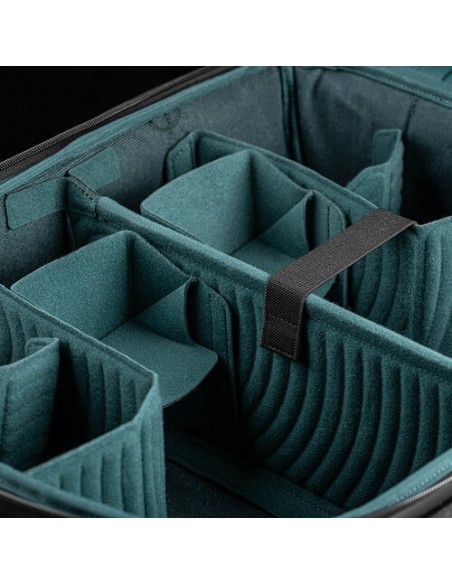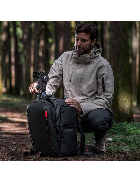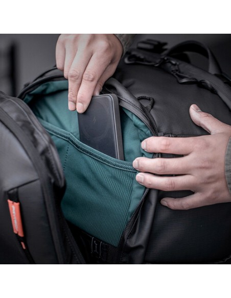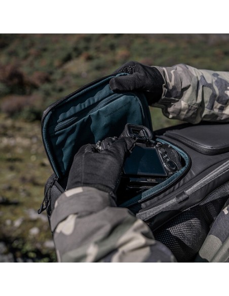 Il pannello posteriore ad alte prestazioni e il cinturino in vita largo e spesso offrono un maggiore comfort in movimento. Il pacchetto è dotato di accesso in alto e sul lato destro per afferrare facilmente gli obiettivi a lunga messa a fuoco. La superficie rivestita in PU e la copertura antipioggia sono a prova di schizzi per proteggere la tua attrezzatura da condizioni meteorologiche impreviste. Gli spallacci hanno una tasca per riporre il telefono e ti permettono di attaccare una clip per fotocamera opzionale. Altri dettagli orientati all'utente, tra cui le maniglie multiple e i punti di attacco, il sistema di indicazione della batteria, le cerniere YKK e la tasca segreta AirTag, massimizzano la tua esperienza creativa.