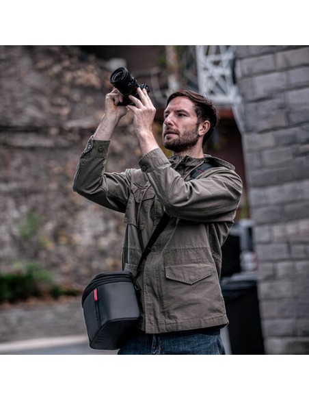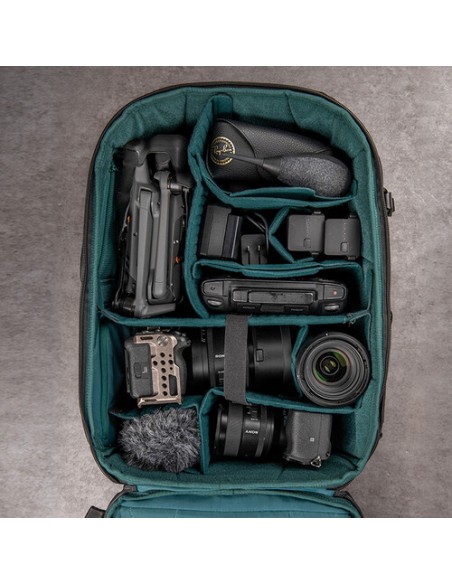 Il pannello posteriore ad alte prestazioni e il cinturino in vita largo e spesso offrono un maggiore comfort in movimento. Il pacchetto è dotato di accesso in alto e sul lato destro per afferrare facilmente gli obiettivi a lunga messa a fuoco. La superficie rivestita in PU e la copertura antipioggia sono a prova di schizzi per proteggere la tua attrezzatura da condizioni meteorologiche impreviste. Gli spallacci hanno una tasca per riporre il telefono e ti permettono di attaccare una clip per fotocamera opzionale. Altri dettagli orientati all'utente, tra cui le maniglie multiple e i punti di attacco, il sistema di indicazione della batteria, le cerniere YKK e la tasca segreta AirTag, massimizzano la tua esperienza creativa.