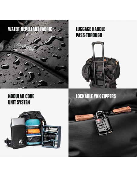 - Le unità di base opzionali di Shimoda Designs possono essere installate all'interno del pacchetto e riconfigurate per soddisfare le tue esigenze, sia che tu abbia bisogno di apparecchiature per fotocamere, video, audio o multimediali digitali