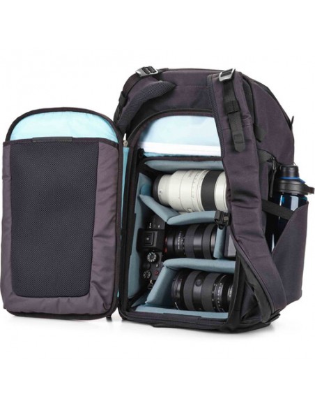 Le tasche organizer interne tengono al sicuro il telefono, le batterie e i cavi. Le tasche laterali esterne designate possono contenere una bottiglia d'acqua o un treppiede e sono presenti cinghie regolabili per mantenere il treppiede in posizione. Trasporta lo zaino con le maniglie retrattili laterali e superiori o con la maniglia della base. Indossalo utilizzando le cinghie dello zaino o fissalo al tuo bagaglio a rotelle con la custodia del trolley.