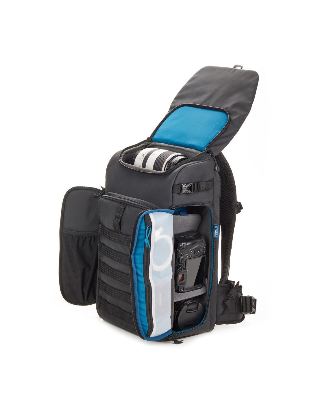Lo zaino Axis V2 LT nero di Tenba ha una capacità di 20 litri ed è la scelta ideale per trasportare la tua attrezzatura fotografica e gli effetti personali. Questo zaino può contenere due fotocamere mirrorless o DSLR con quattro o sei obiettivi e un obiettivo montato fino a 70-200 mm f/2.8. Puoi anche riporre un laptop da 16" nell'apposita tasca. Sotto la patta superiore c'è una sezione convertibile per zaino da giorno che puoi utilizzare per altra attrezzatura fotografica, un kit per drone, cibo o una giacca antipioggia. La cinghia MOLLE esterna consente l'espansione con capsule per obiettivi Tenba Tools, custodie per batterie e porta schede di memoria, oltre a una varietà di custodie e accessori di standard militare. L'imbracatura Airflow di Tenba e le cinghie Pivot-Fit autoregolanti consentono allo zaino di adattarsi comodamente a utenti di varie taglie. Questo zaino è dotato di doppio accesso laterale per la fotocamera e c'è una tasca nascosta progettata per contenere un localizzatore personale come un Apple AirTag o un Tile Bluetooth Tracker.