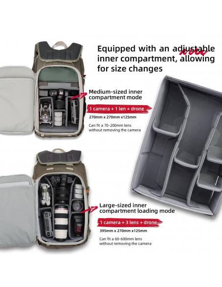 Questo zaino fotografico è dotato di un inserto fotografico interno pieghevole brevettato che offre una funzione di “espansione e contrazione”. Quando l`inserto è caricato a metà, si trasforma in una modalità per la fotografia all`aperto, in grado di ospitare metà attrezzatura fotografica e metà attrezzatura per l`outdoor. A pieno carico, diventa una borsa fotografica ad alta capacità. Senza inserto fotografico, diviene un ottimo zaino per outdoor.