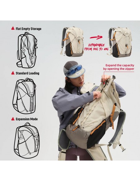 L`interno può essere liberamente personalizzato in base alle proprie esigenze, consentendo di scegliere diverse modalità di carico. Perfetto per la fotografia, l`escursionismo, il campeggio e i viaggi. Dotato di un esclusivo sistema di espansione, il 25L può essere ampliato a 33L e il 35L a 43L.